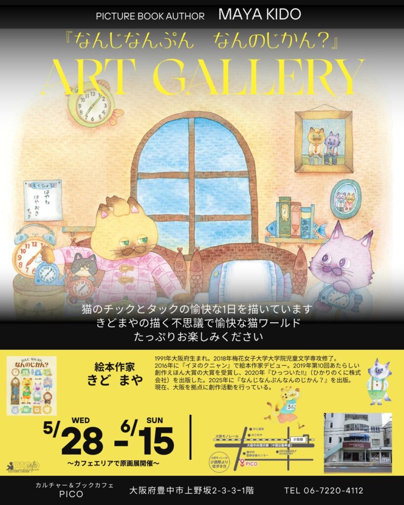 新刊「なんじ なんぷん なんのじかん?」(きど まや/作・絵)発売を記念して、原画展とワークショップが開催されます。