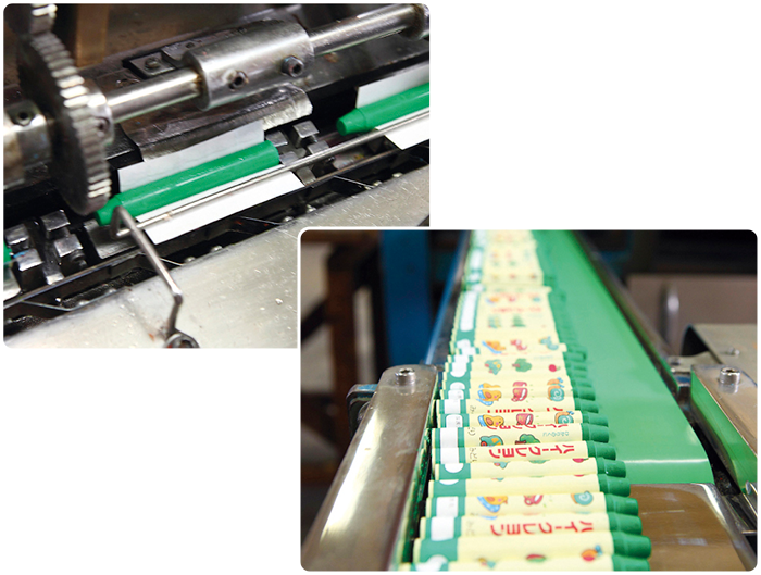 完成したクレヨンに1分間に200本のスピードで巻き紙を巻きつけていきます。