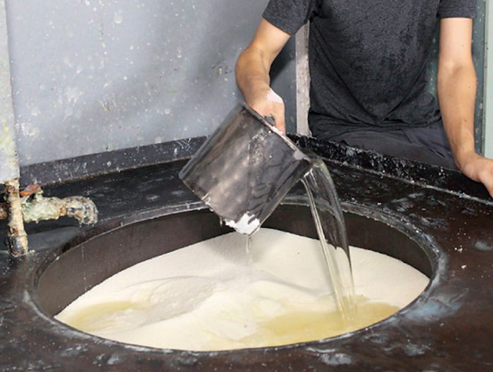 釜からうつした原料に色のもとである顔料等を 溶かして色付けします。
